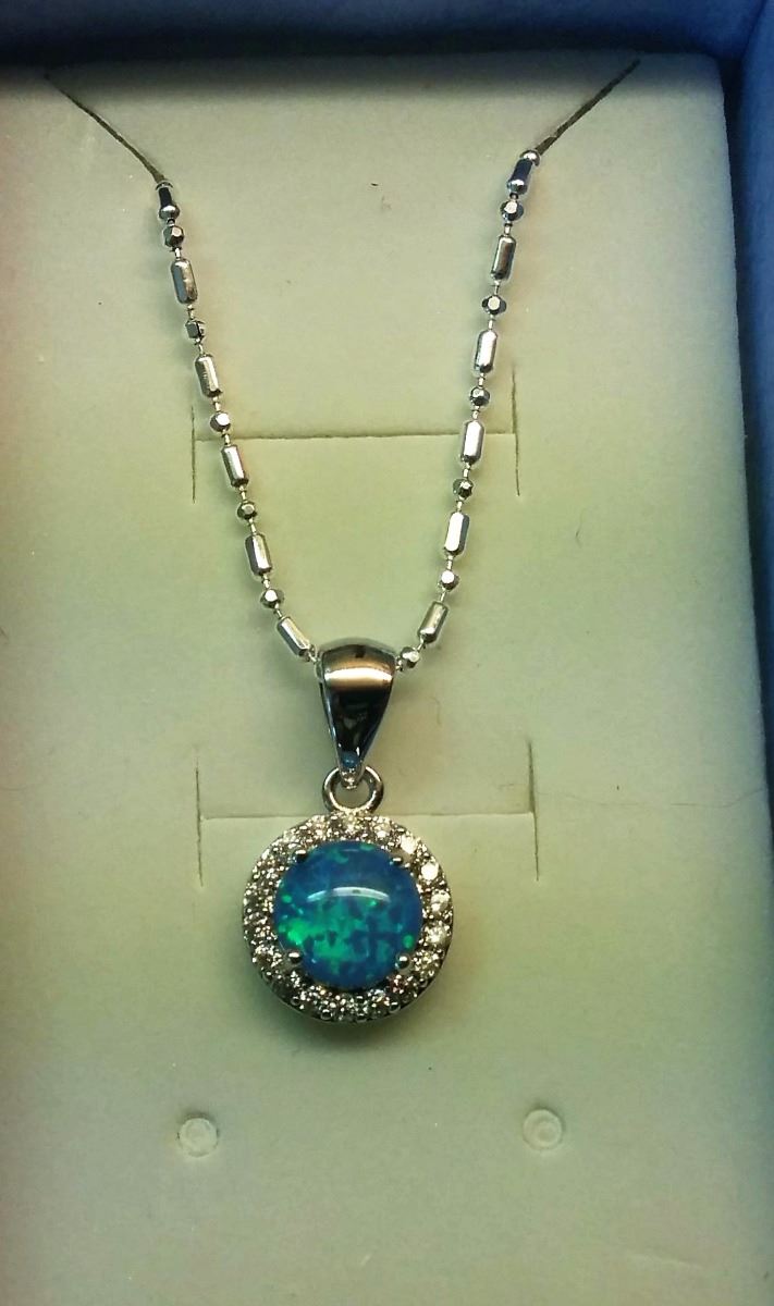 ROUND BLUE FIRE OPAL & CZ PENDANT ON CHAIN