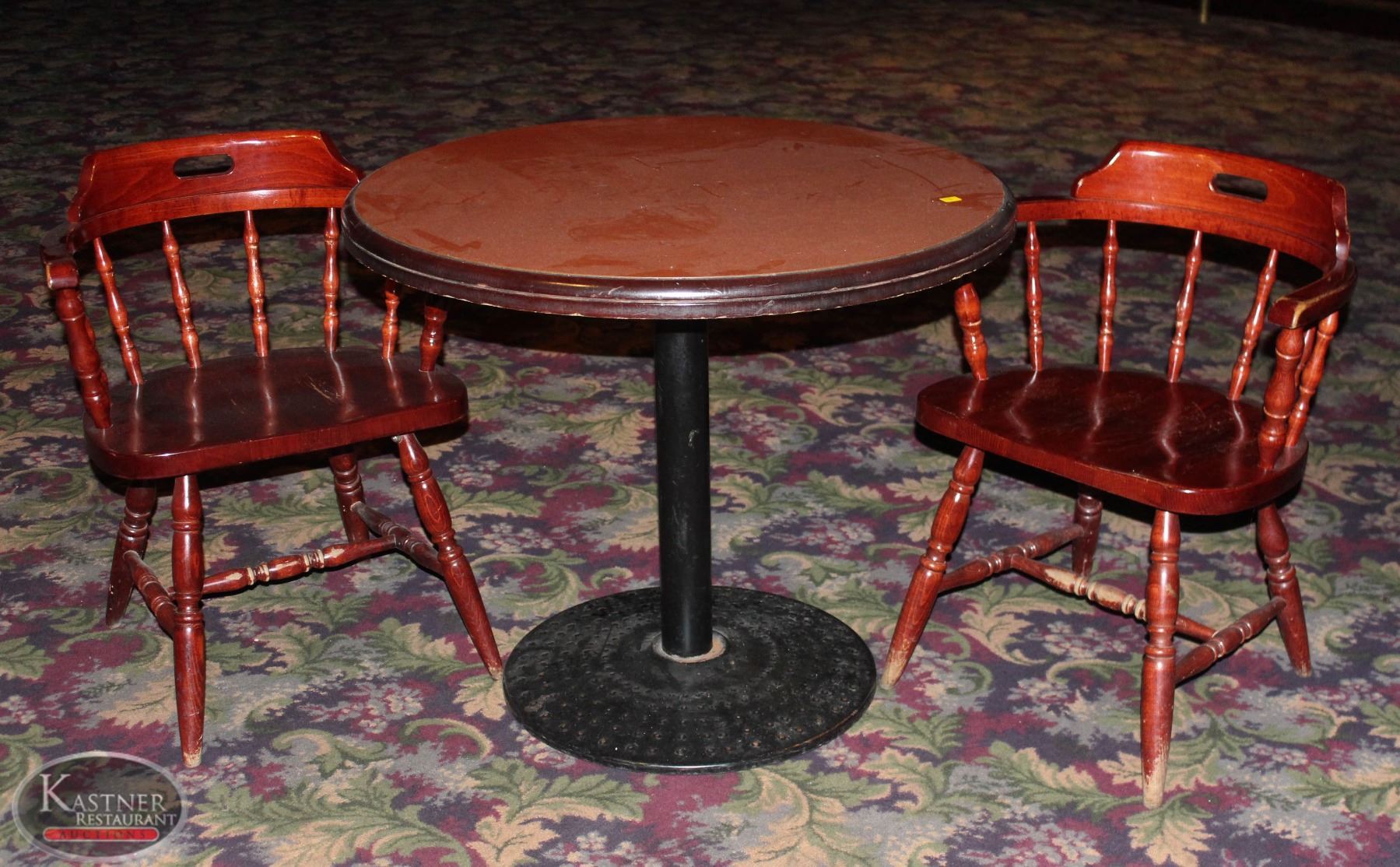 ROUND WOOD TABLE W/ 2 WOOD ARMCHAIRS