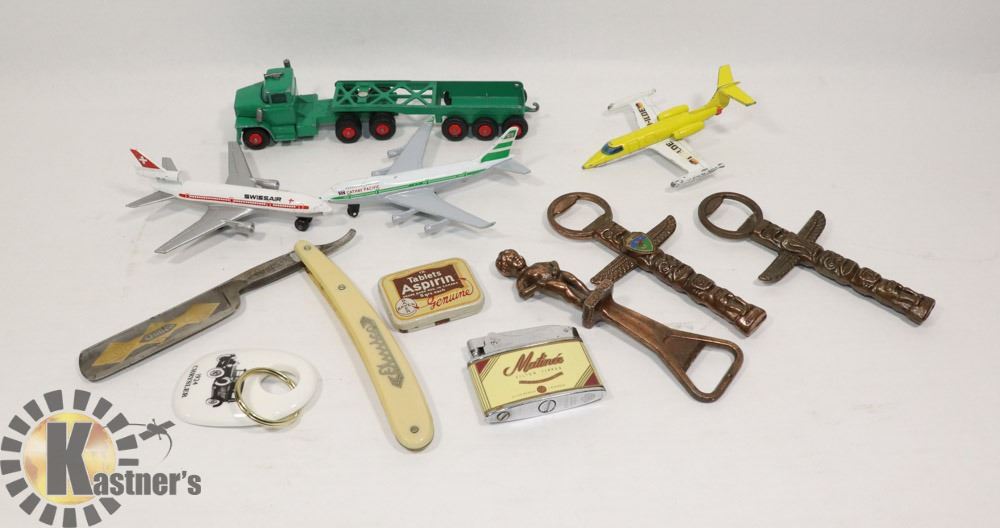 PILL BOX, BAGTCH MOX PLANE, STRAIGHT EDGE RAZOR, MATCH BOX TRUCK, BOTTLE OPENERS