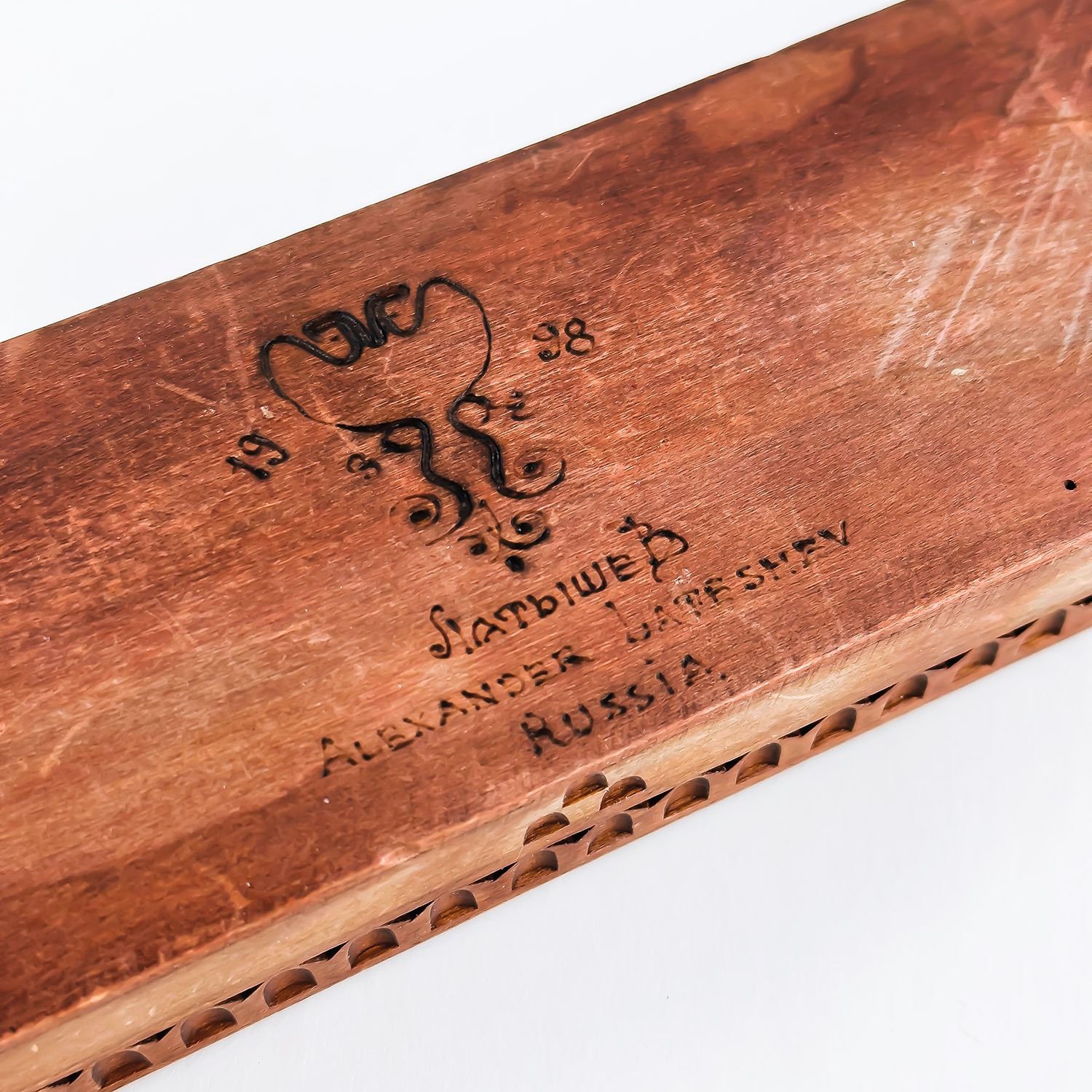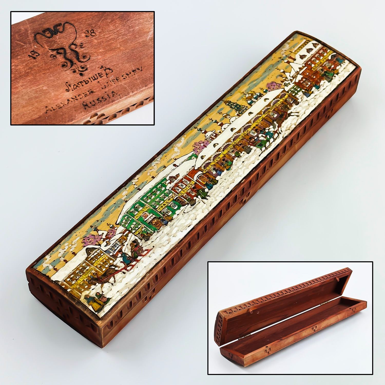 #8308 - SIGNED HAND CARVED & PAINTED PENCIL OR TRINKET BOX - WOOD CARVING BY ALEXANDER LATESHEV FROM RUSSIA. DESIGN FEATURES RUSSIAN BUILDINGS IN WINTER - WITH HORSE DRAWN SLEIGHS AND PEOPLE ON THE STREET - DATED 1998. MEASURES: 11.25” (28.5 CM) LONG BY 2.375” (6 CM) WIDE AND 1.375” (3.5 CM) HIGH