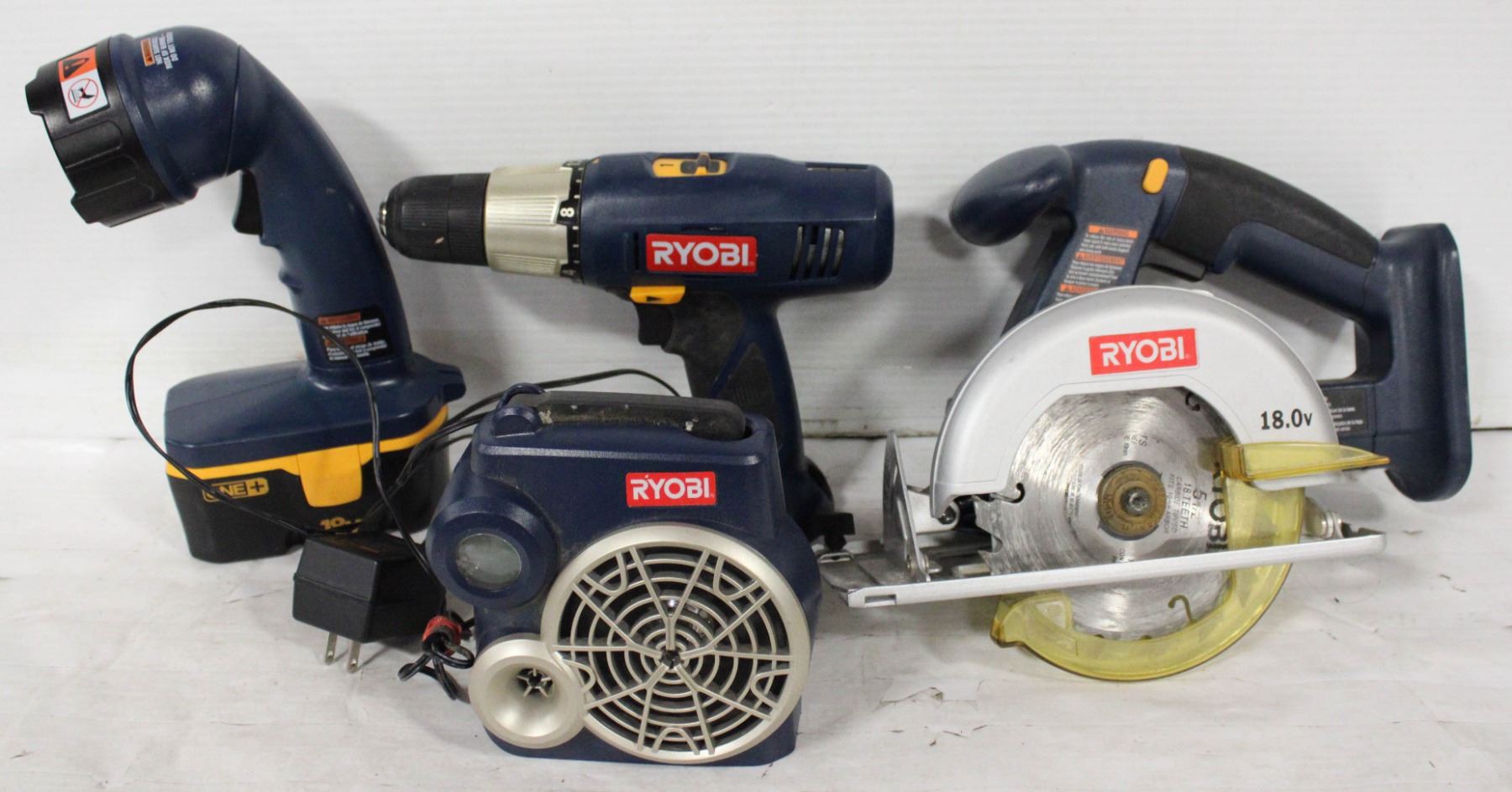 RYOBI CIRCULAR SAW, DRILL, RADIO, FLASHLIGHT &