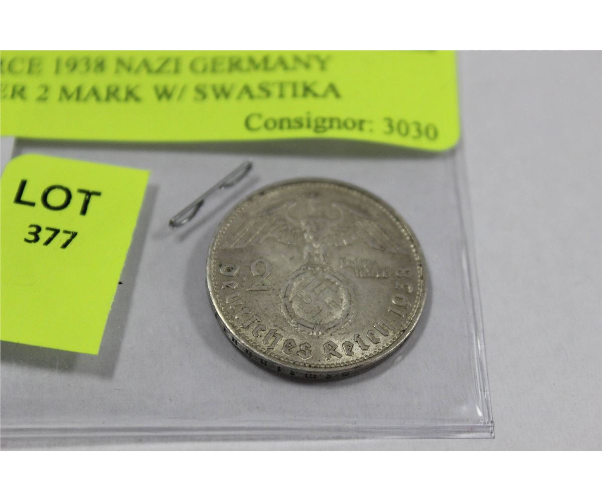 SCARCE 1938 NAZI GERMANY SILVER 2 MARK W/ SWASTIKA