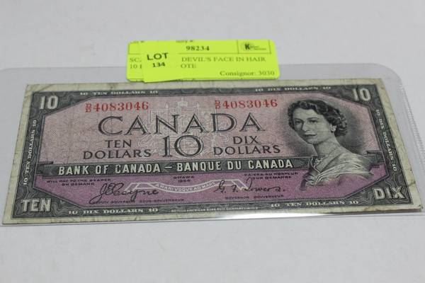 SCARCE 1954 DEVIL'S FACE IN HAIR 10 DOLLAR NOTE