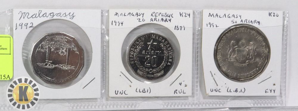 VERY HARD TO FIND, LOT OF 3 MADAGASCAR COINS IN UNCIRCULATED CONDITION. 3 COMMEMORATIVE ISSUES INCLUDING 1-20 ARIARY, AND 2- 50 ARIARY COINS***ITEM LOCATED IN LETHBRIDGE AB