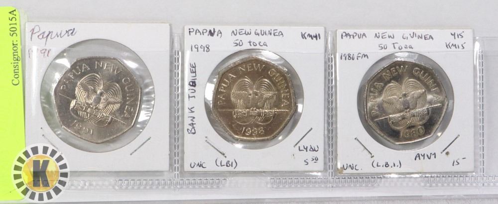 HIGH CATALOG VALUE AND LOW MINTAGE GROUP OF PAPUA NEW GUINEA 50-TOEA COINS 1980,1991, 1998. ALL COMMEMORATIVE ISSUES.***ITEM LOCATED IN LETHBRIDGE AB