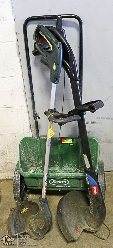 SCOTTS FERTILIZER SPREADER WITH 2 WEED WHACKERS