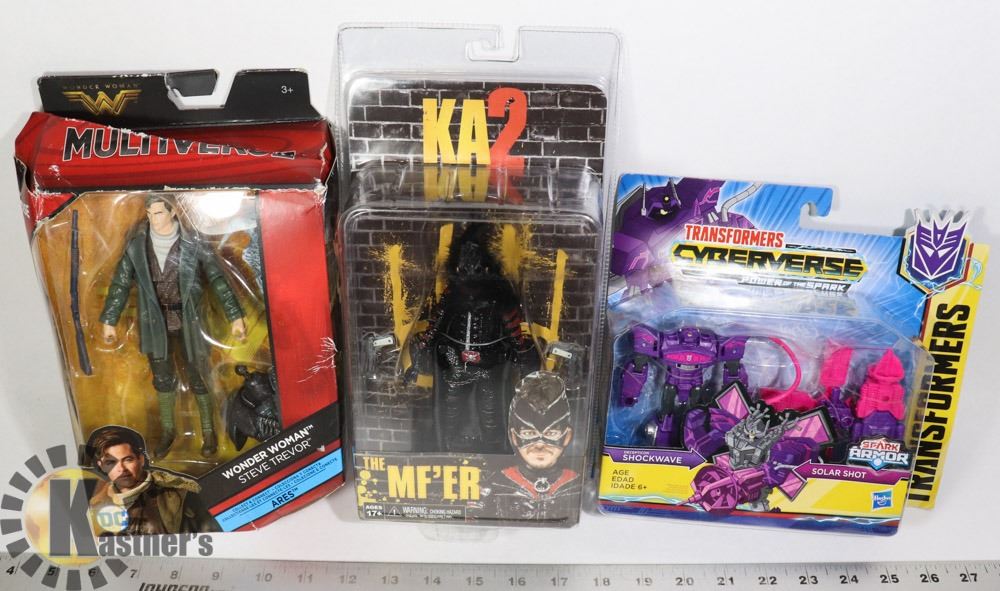KICK ASS KA2 THE MF'ER & DC COMICS MULTIVERSE WONDER WOMAN STEVE TREVOR W/TRANSFORMERS CYBERVERSE POWER OF SPORT SHOCK WAVE AUTHENTIC. COLLECTIBLES