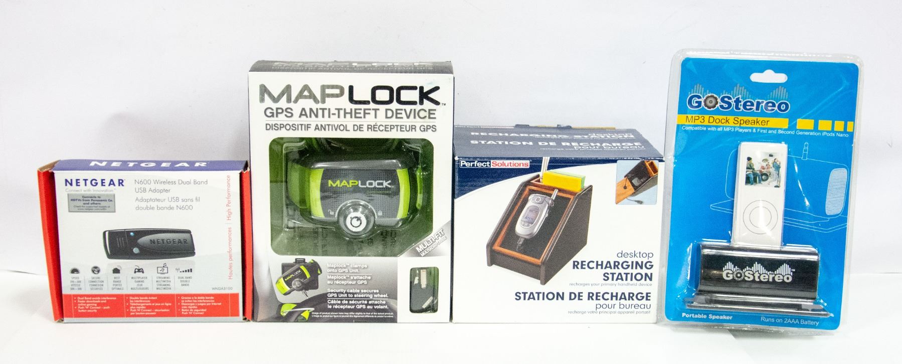 MP3 IPOD NANO 1ST 2ND GENERATION PORTABLE DOCK SPEAKER #319 W/MAPLOCK GPS ANIT-THEFT DEVICE W/NETGEAR WIRELESS ADAPTER N600 DUAL BAND & PERFECT SOLUTIONS DESKTOP RECHARGING STATION STORAGE CADDY WOOD FINISH