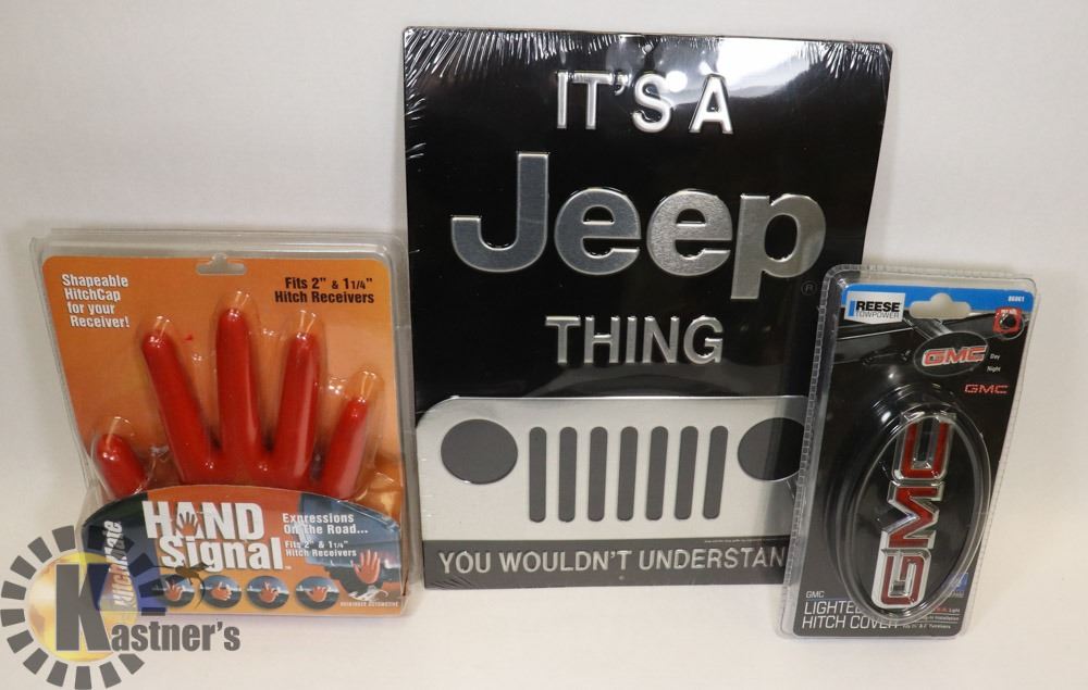 EXPRESSIONS ON THE ROAD FITS 2" & 1 1/4"HITCH W/REESETOWER GMC OFFICIAL LIGHTED TRAILER HITCH COVER LED & METAL JEEP SIGN. MISC