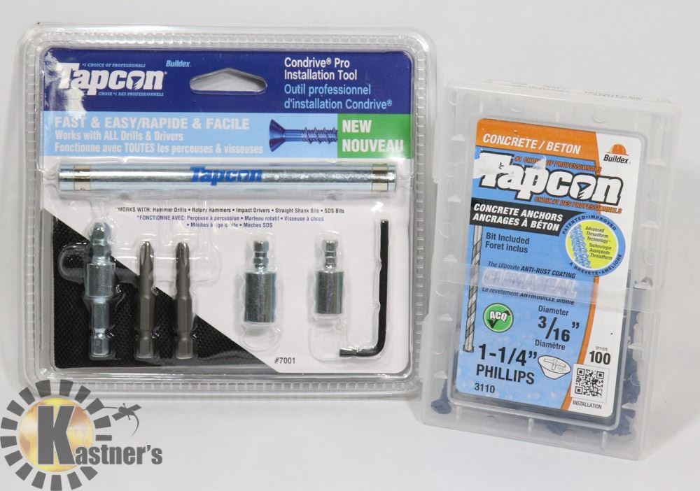 INSTALLATION KIT #7001 W/TAPCON CONCRETE ANCHORS 1- 1/4" X 3 1/8" DIMENSION. TOOLS