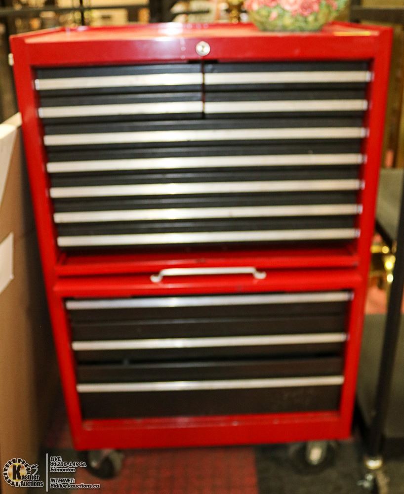 TOOL BOX - BUTTERFLY FRONT CLOSE, CARPETED DRAWERS, OVER-SIZE CASTORS (29"L X 18"W X 43.5"H) AS IS