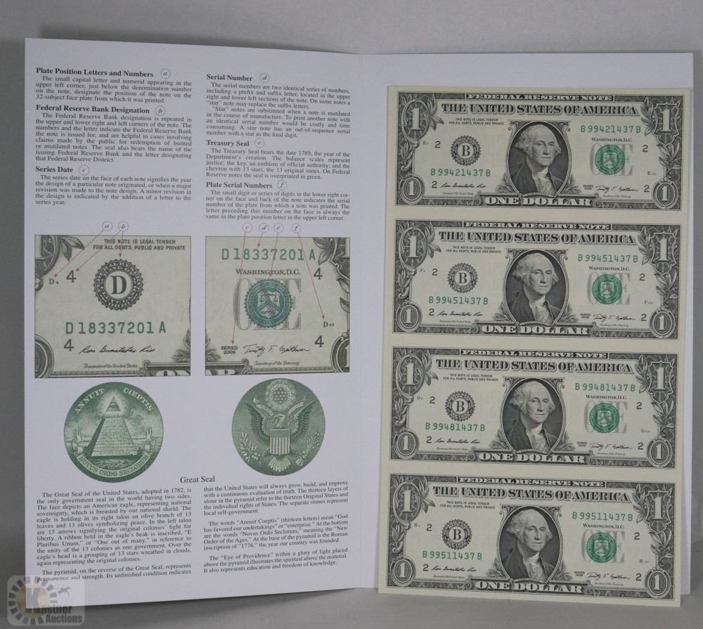 SERIES 2009 US UNCUT $1 DOLLAR BILLS (1 SHEET OF 4
