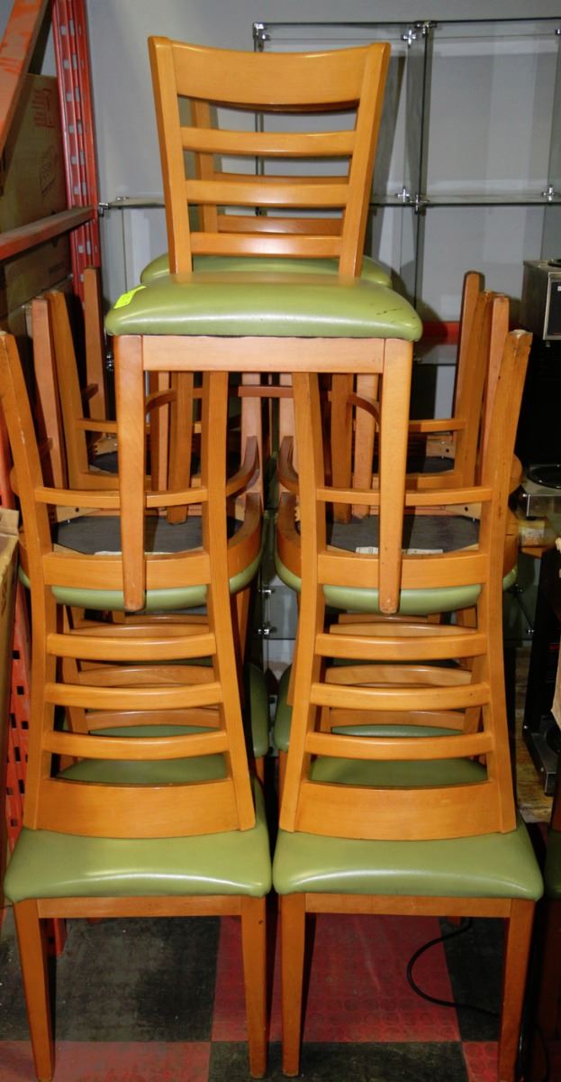 SET OF 10 OAK CHAIRS W/ LIME COLOURED SEATS