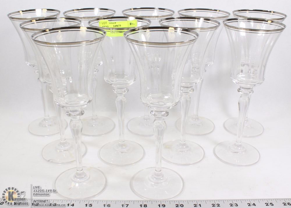 SET OF 11 SILVER RIM 9" TALL CRYSTAL WINE GLASSES