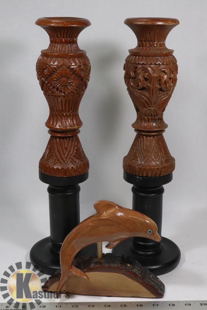 CARVED DOLPHIN AND 2 BLACK CANDLESTICKS