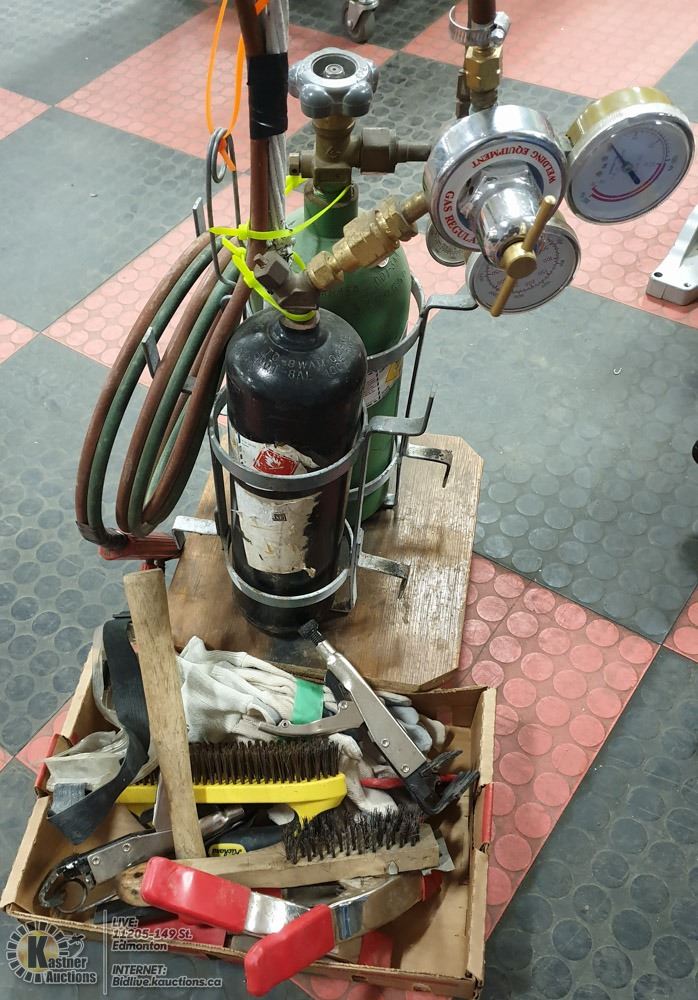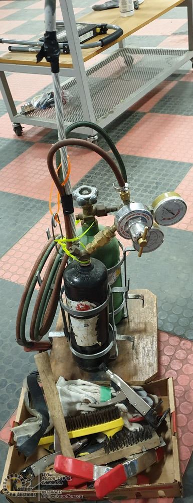 OXYGEN AND ACETELYNE TANKS, REGULATORS AND A CUTTING TORCH, (CUTTING TORCH ITSELF IS IN FAIR CONDITION). SEATED ON A SMALL WHEELED DOLLY, WITH ACCESSORIES, 5 PAIR NEW LEATHER PALM GLOVES, CLAMPS, CHIPPING HAMMER, ETC. - TOOLS