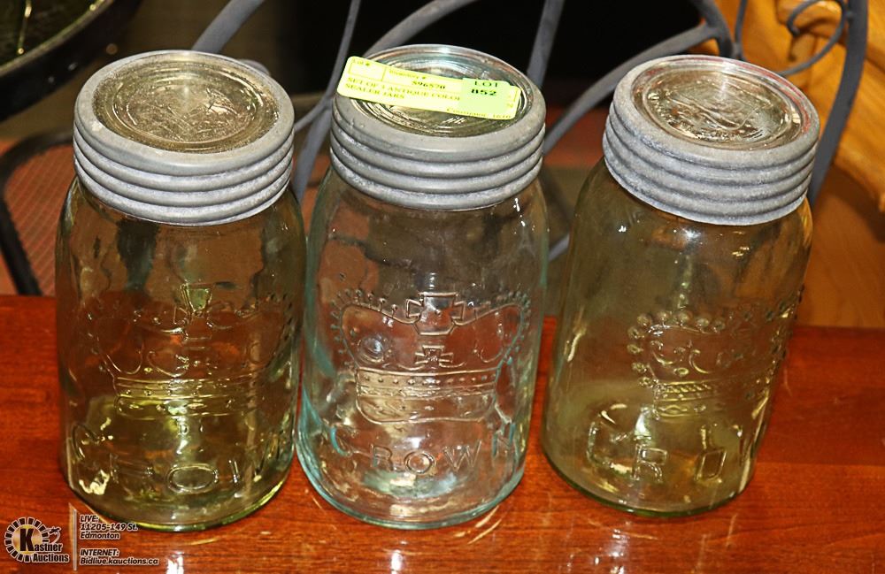 SET OF 3 ANTIQUE COLORED CROWN SEALER JARS