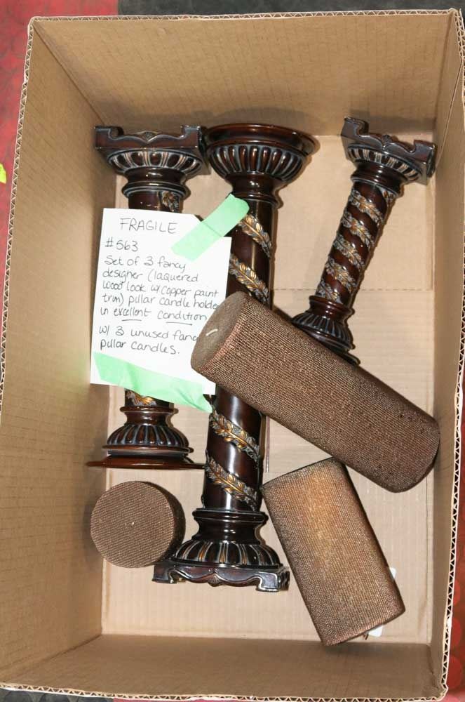 WITH COPPER PAINT TRIM, PILLAR CANDLE HOLDERS WITH 3 UNUSED PILLAR CANDLES. HOME