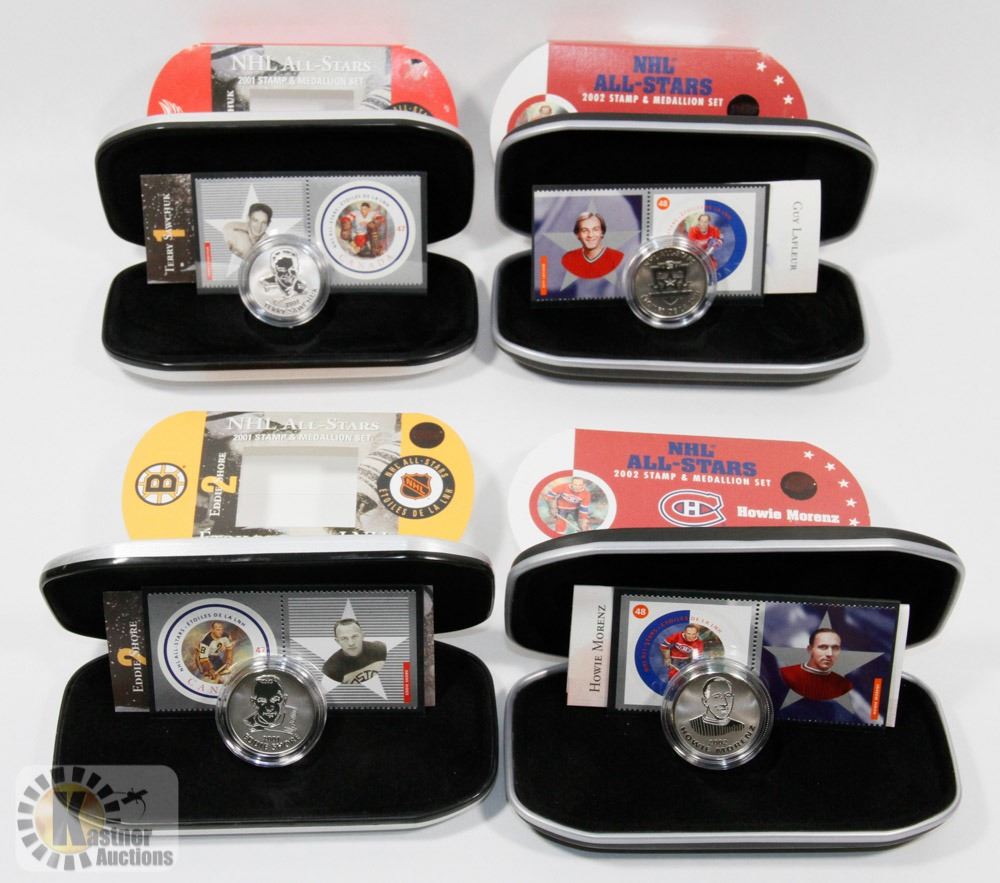ALL STARS STERLING SILVER COIN & STAMP MEDALLION SET GUY LAFLEUR & HOWIE MORENZ & 2001 EDDIE SHORE & TERRY SAWCHUK. COLLECTIBLES