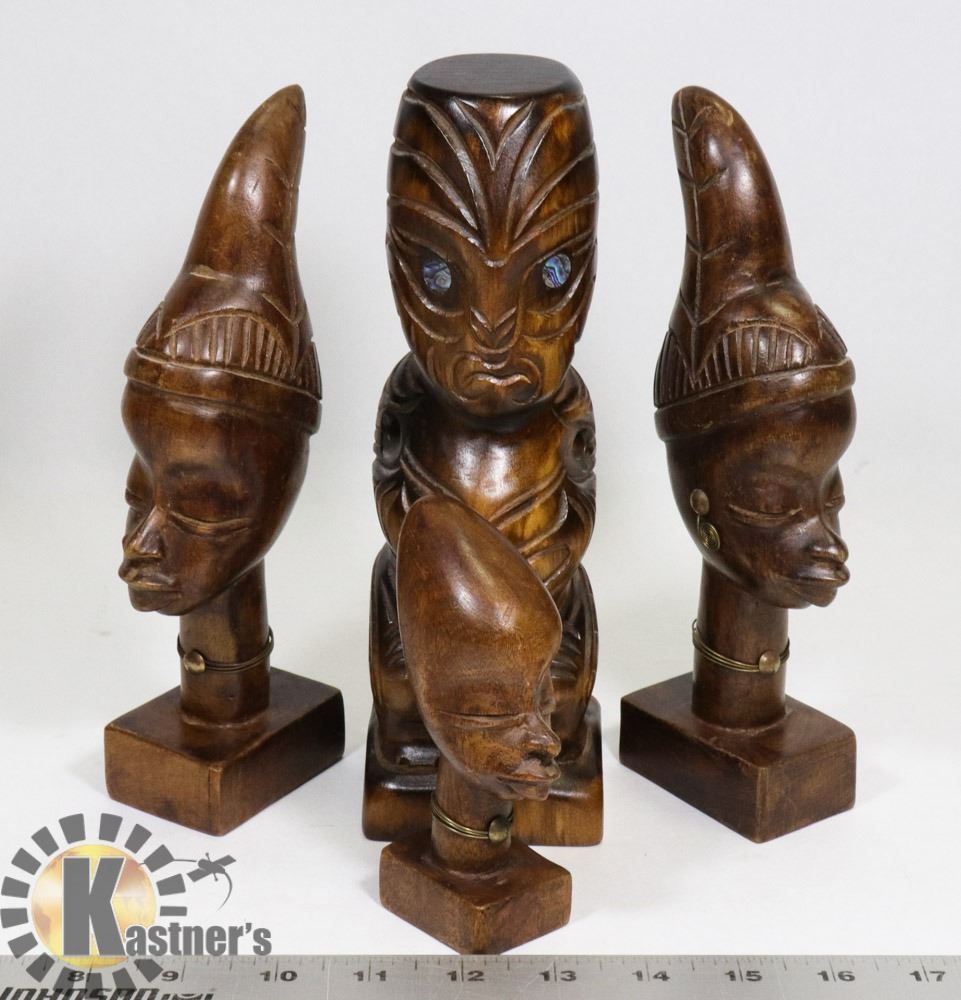 SET OF 4 HAND CARVED NEW ZEALAND TEKO FIGURES.