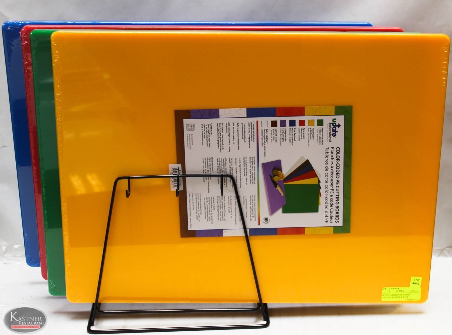 NEW UPDATE INTERNATIONAL, INCLUDES: UPDATE CBRK-6N CUTTING BOARD RACK - HOLDS 6 BOARDS, 12" X 9" X 10", BOARDS SIZE: 18" X 24" X 1/2", COLOURS: BLUE (RAW FISH), GREEN (VEGETABLES & FRUIT), RED (RAW MEAT), YELLOW(RAW POULTRY), POLYETHYLENE