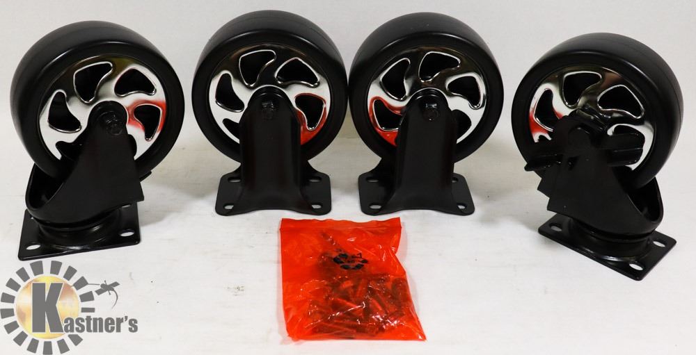 2 STATIONARY, 2 ROTATING WITH BRAKES ; WITH BOLT HARDWARE. TOOLS.