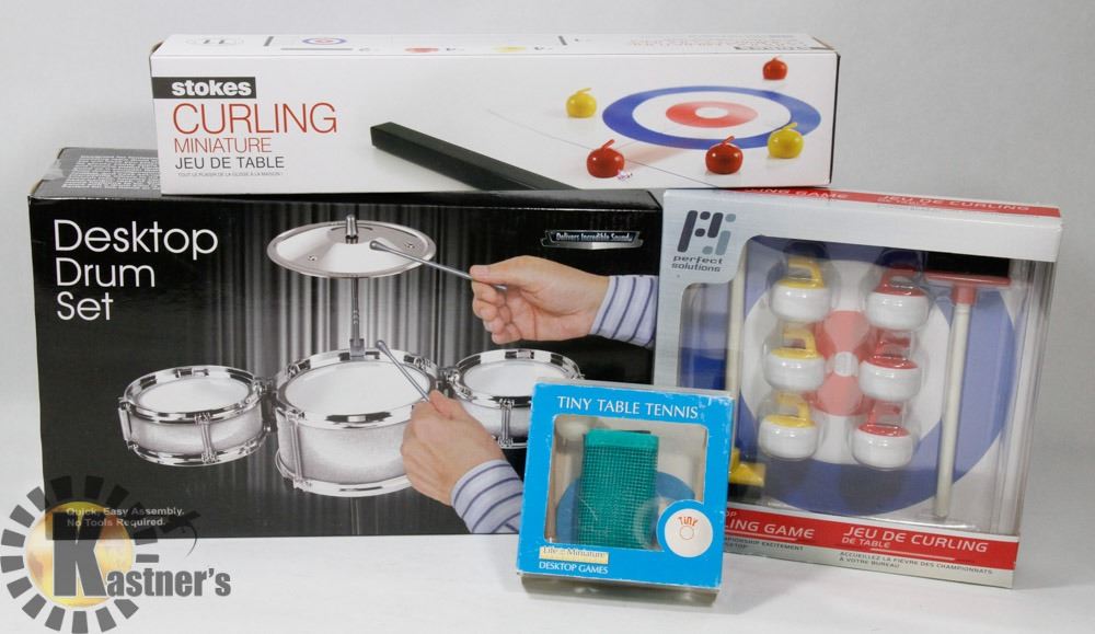DRUMSET, 2 DIFFERENT CURLING SETS & TABLE TENNIS. MISC