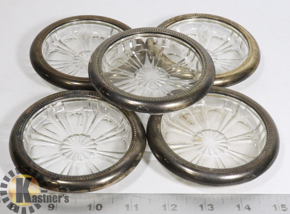 SET OF 5 SILVER AND GLASS ASHTRAYS