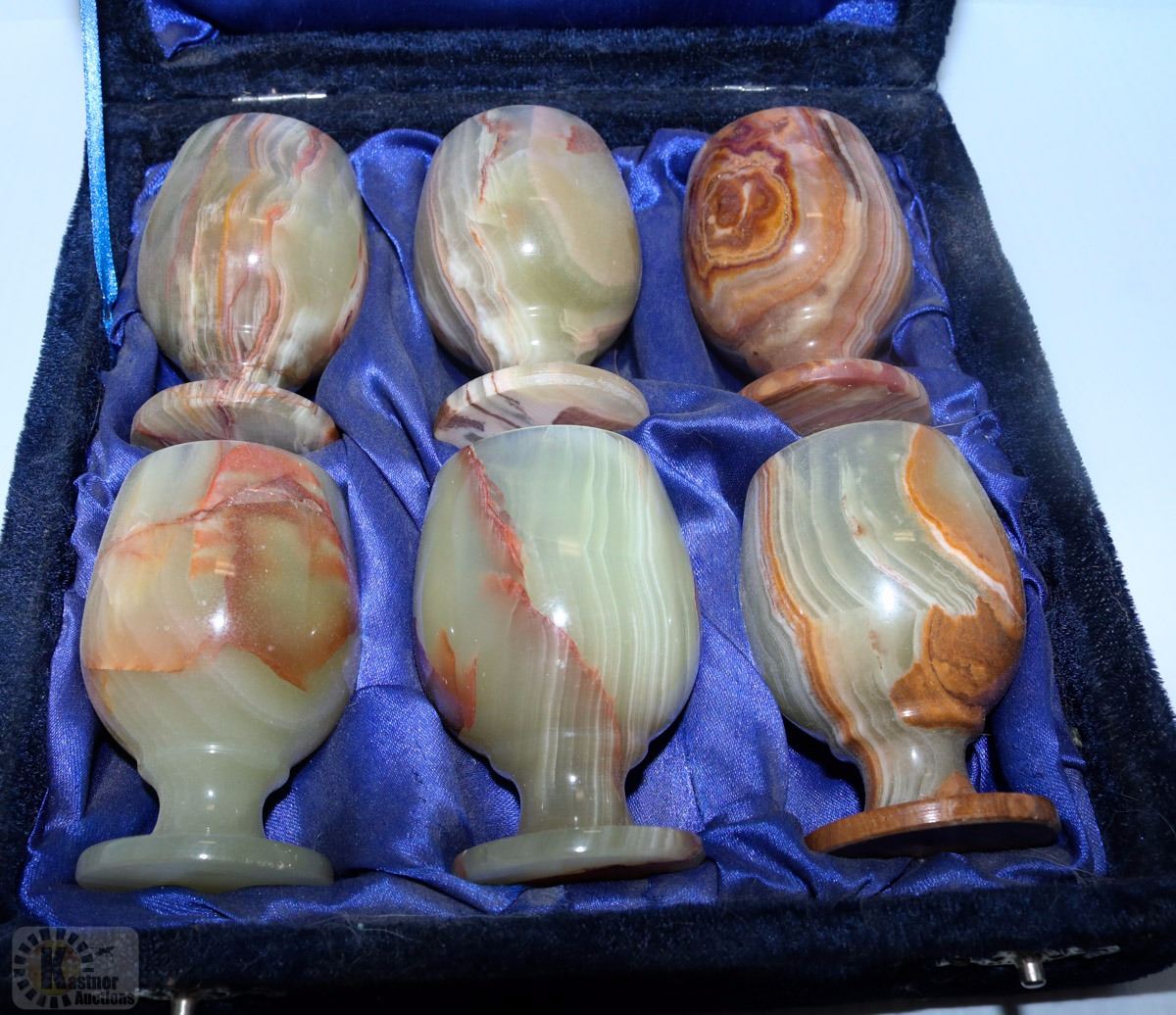 SET OF 6 GREEN ONYX SHOT/WINE GLASSES IN CASE