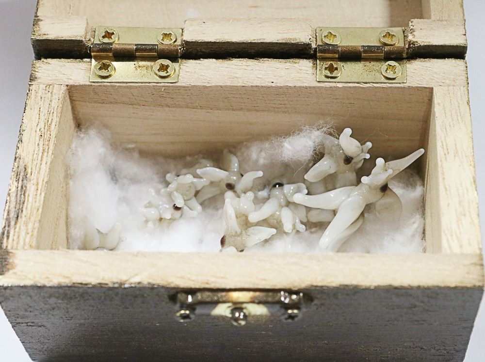 SET OF 8 HAND MADE GLASS LUCKY ELEPHANTS IN BOX