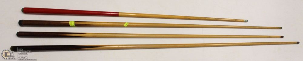 SET OF FOUR ASSORTED POOL CUES/STICKS