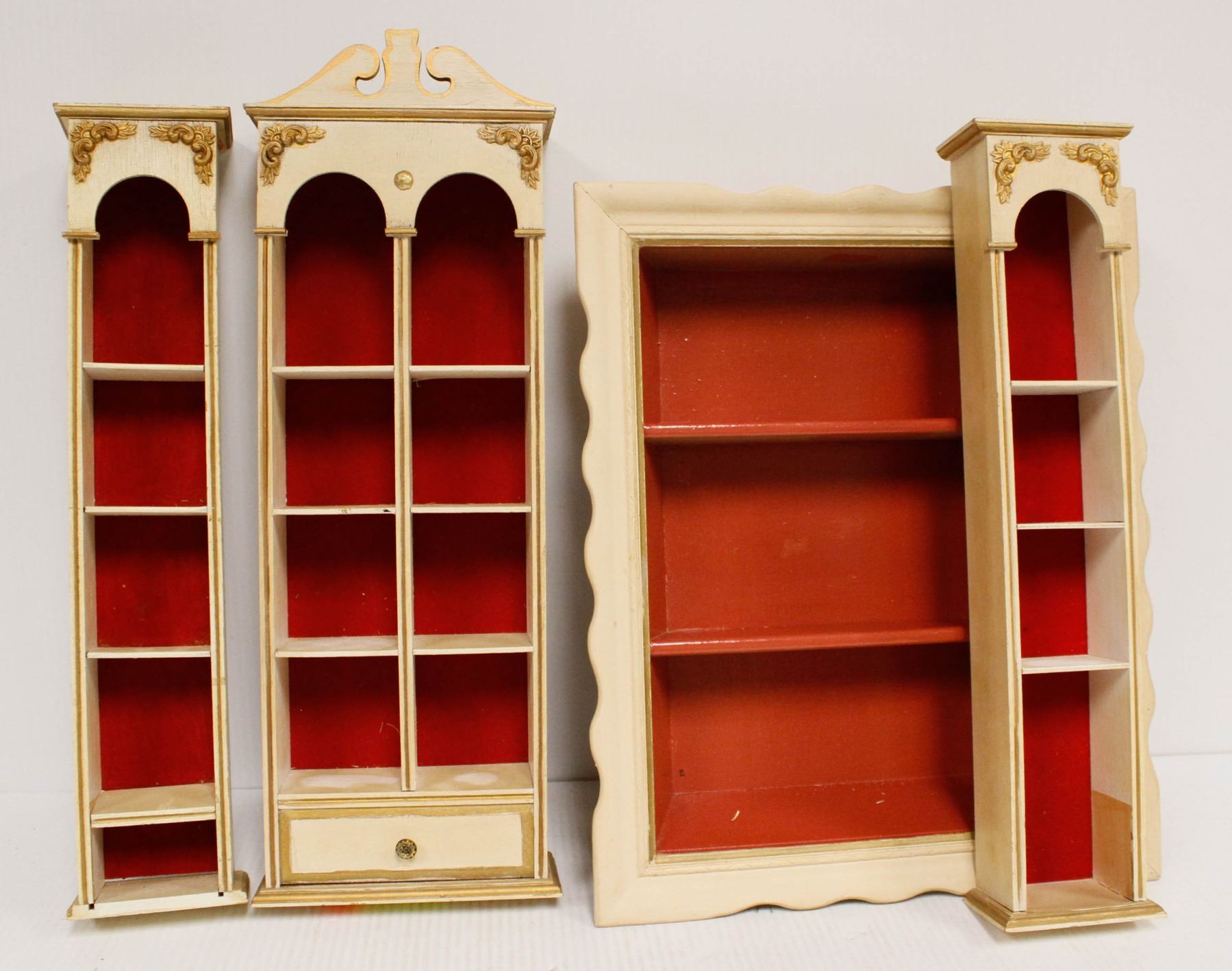 SET OF THREE RED BACKED CURIO SHELVES WALL MOUNT