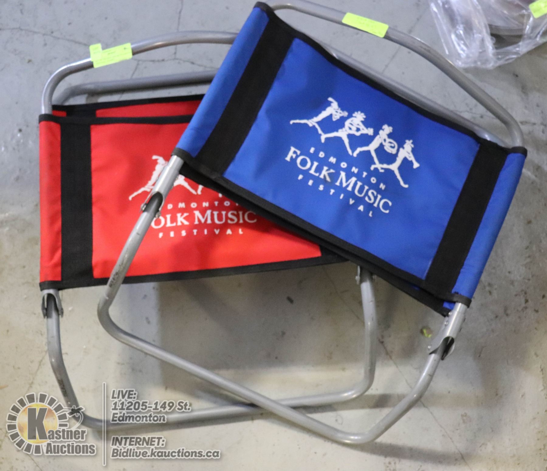 METAL FRAME, EASY FOLD-AWAY WITH FOLK MUSIC FESTIVAL BANNERS (20"L X 25"W X 20"H-AT TOP OF BACK)