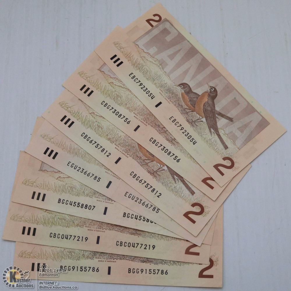 SEVEN 1986 CANADIAN $2 BILLS WITH ROBINS