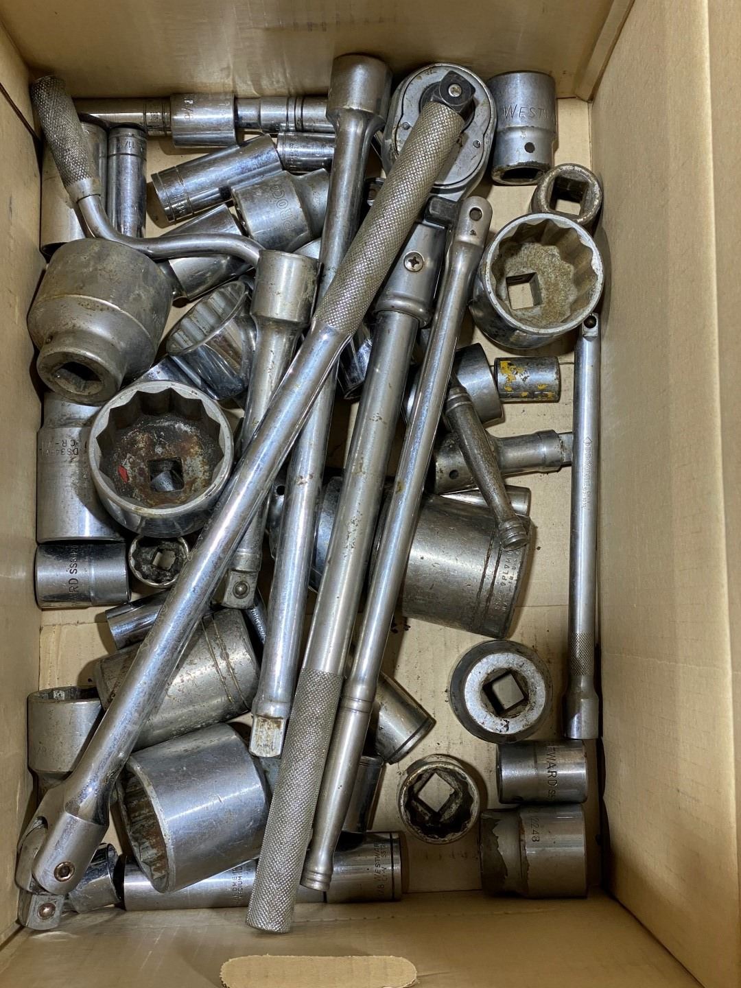 SH. PARK: BOX OF ASSORTED 1/2" SOCKETS / WRENCHES