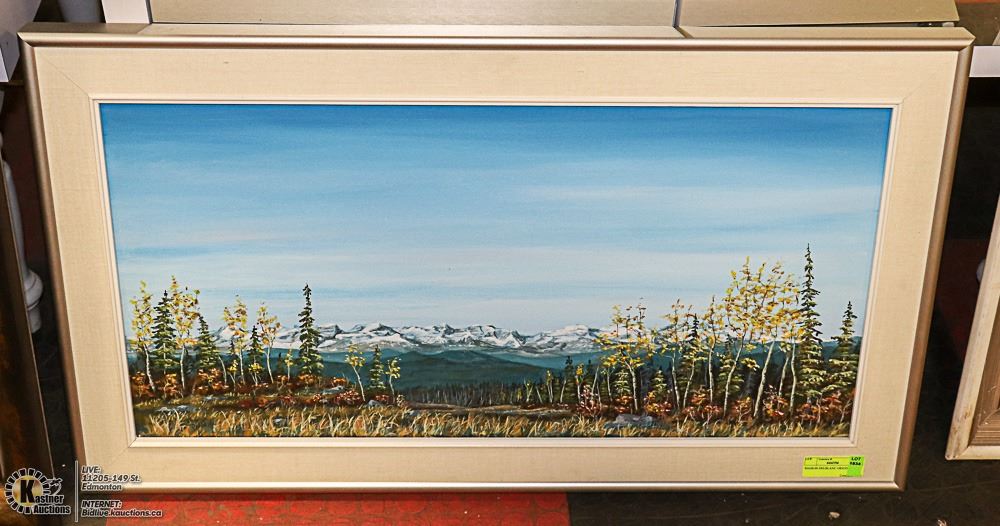 "SNOW IN THE AIR NEAR HINTON". SIGNED ON BACK. ARTIST BIO INCLUDED. FRAMED 34 X 19"-ART