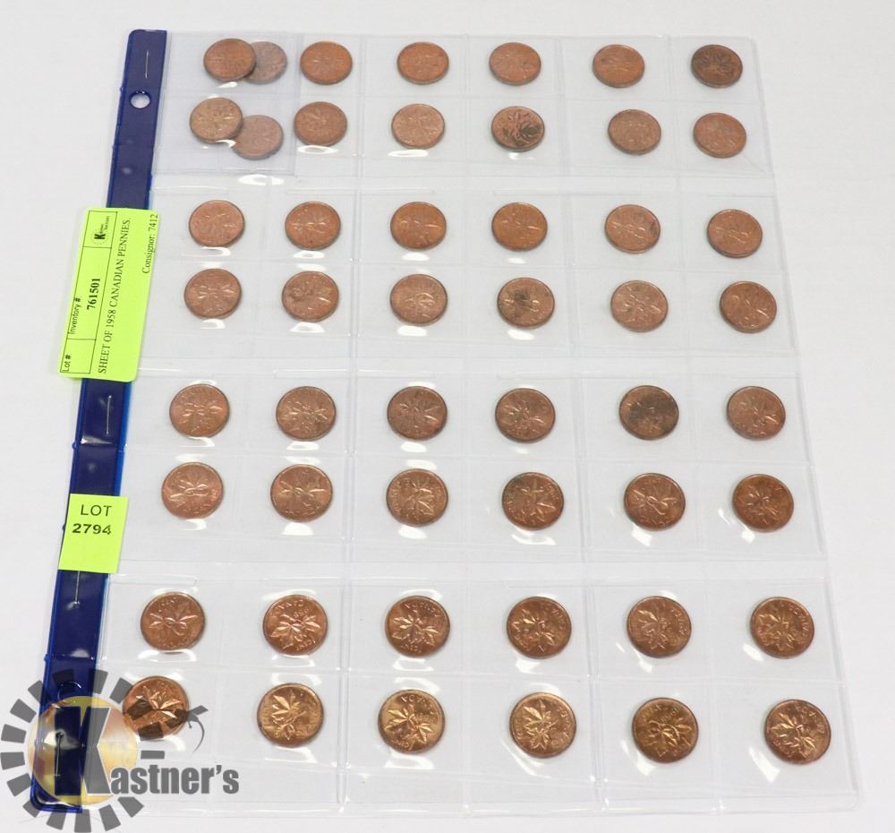 SHEET OF 1958 CANADIAN PENNIES.