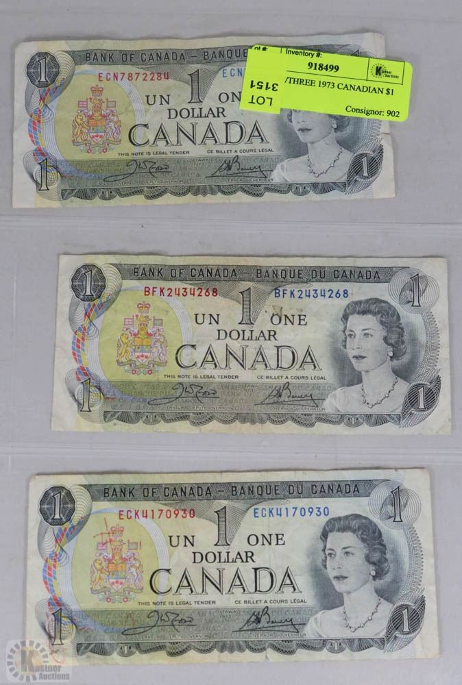 SHEET W/THREE 1973 CANADIAN $1 BILLS