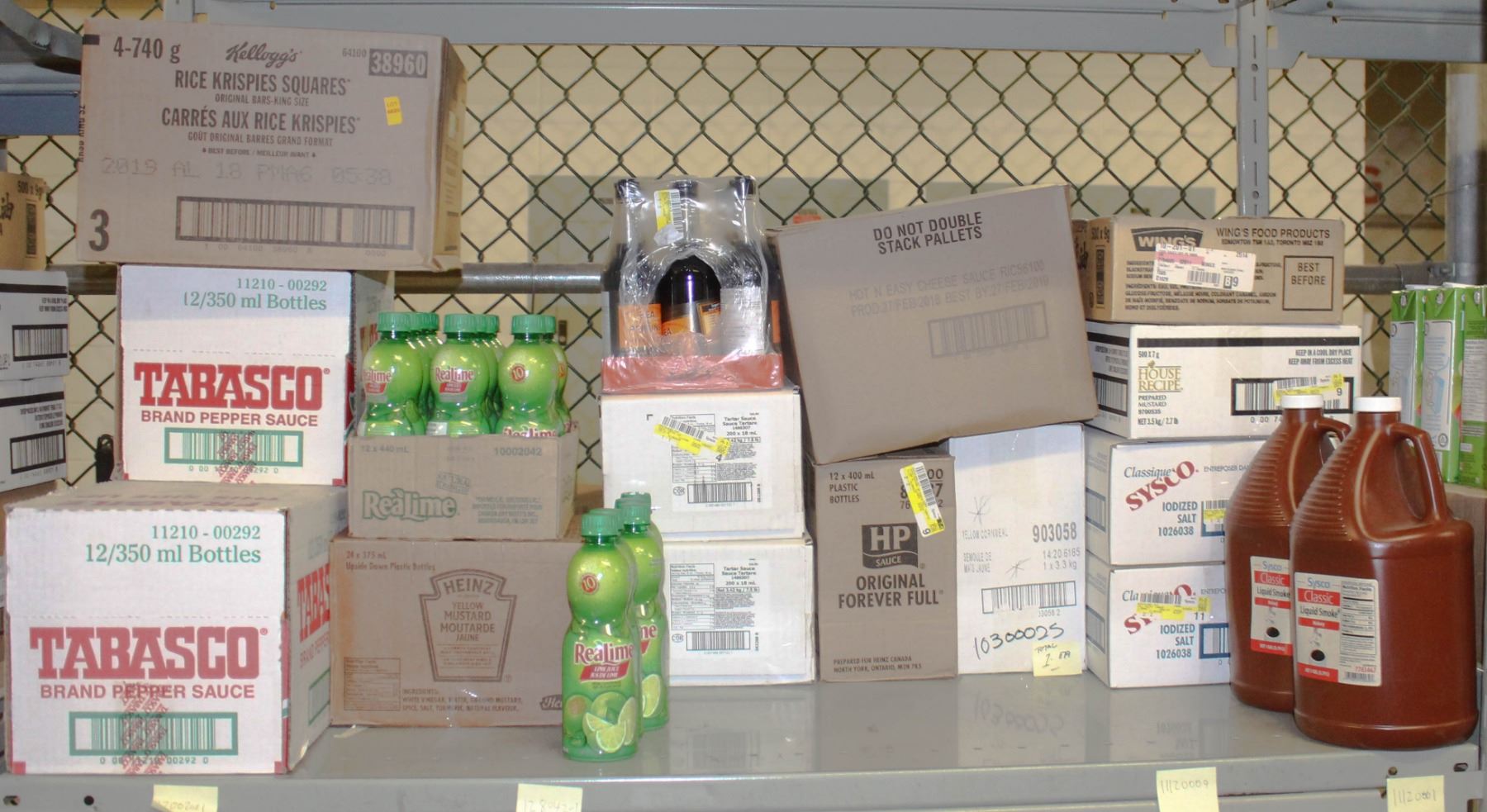 RICE KRISPIES TABASCO SAUCE REAL LIME LIME JUICE HEINZ MUSTARD PH SAUCE TARTAR SAUCE WORCESTERSHIRE SAUCE HOT AND EASY CHEES SAUCE CORN MEAL IODISED SALT & MORE