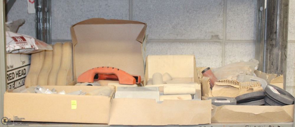 SHELF OF ASSORTED HANDLES, CORNER TROWELS, ETC