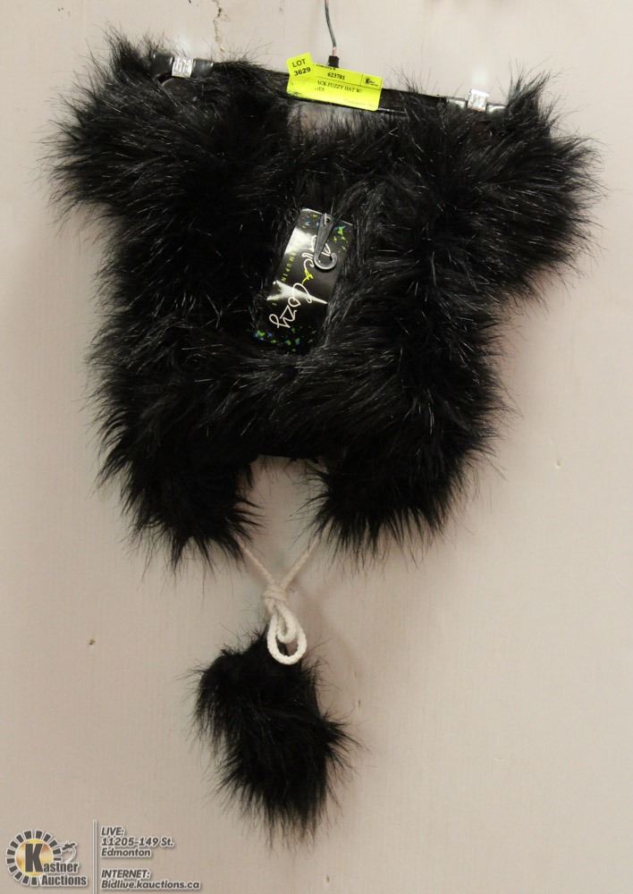 SHORT BLACK FUZZY HAT W/ POMPOM TIES