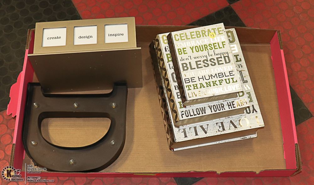3 LARGE HOLLOW DECORE BOOKS WITH INSPIRING PHRASES ON COVERS, STATIONARY BOX WITH INSPIRE, CREATE +DESIGN ON FRONT AND LARGE METAL LETTER D ("ON" BUTTON FOR LIGHTS NEEDS REPAIR) -HOME
