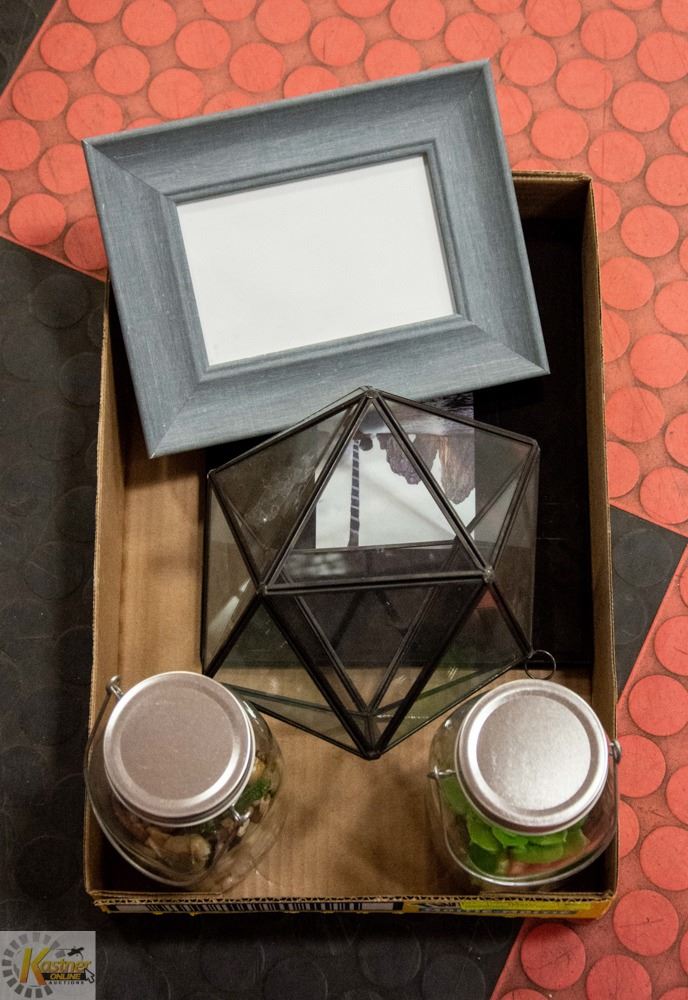 PICTURE FRAMES , DECORATIVE JARS, GLASS & METAL TRIANGULAR PIECE UNUSED