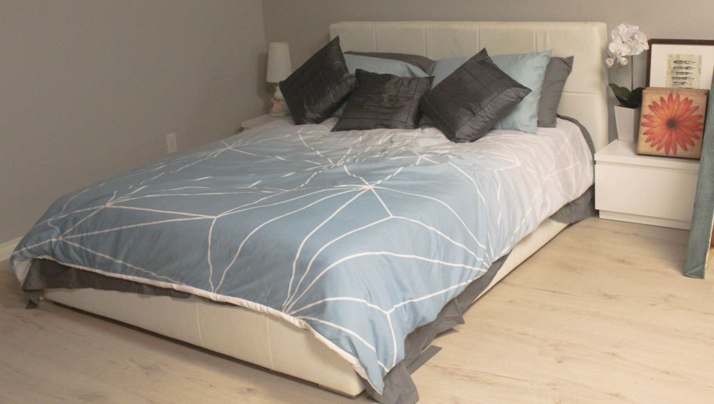WITH MATTRESS, 2 LOW WHITE END TABLES, SHEETS, BLANKET AND PILLOWS