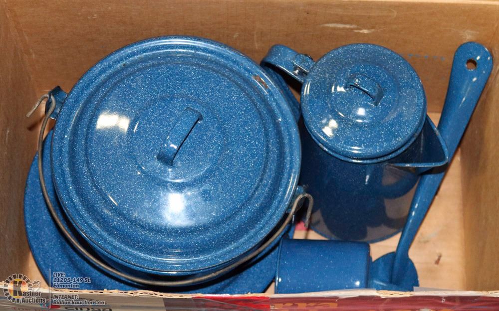 INCLUDES ONE 9 3/5" DIAMETER FRY PAN, FOUR 10" PLATES, FOUR 6" SOUP BOWLS,FOUR SOUP SPOONS, THREE 8 OZ COFFEE CUPS,ONE 2 QT CONICAL COFFEE POT, ONE 12" LENGTH STIRRING SPOON, ONE 4 1/5 QT CONVEX KETTLE AND COVER, ALL ENAMEL - SEASONAL