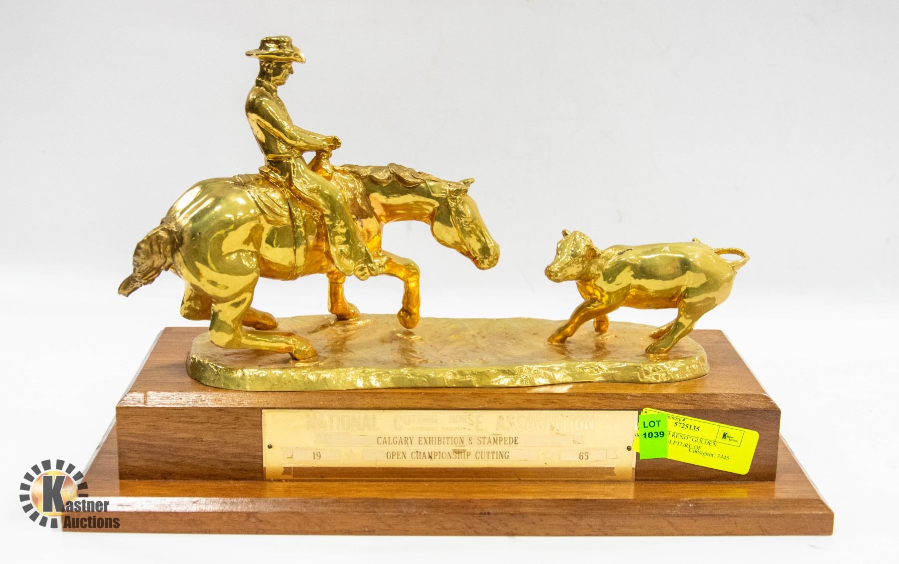 CUTTING HORSE AND CALF 1965 CALGARY STAMPEDE TROPHY FOR CUTTING HORSE EVENT STANDS 11 INCHES TALL ON 8 X 16 INCH WOODEN BASE **ALL ITEMS MUST BE REMOVED BY 5PM SATURDAY, NOVEMBER 12TH 2023. ALL REMAINING ITEMS WILL BE SUBJECT TO A $6.00 PER DAY STORAGE CHARGE. ANY ITEMS REMAINING AFTER MONDAY, NOVEMBER 26TH, 2023 WILL BE CONSIDERED FORFEITED. NO REFUNDS WILL BE ISSUED FOR FORFEITED ITEMS. TO SCHEDULE A PICK UP APPOINTMENT CLICK HERE