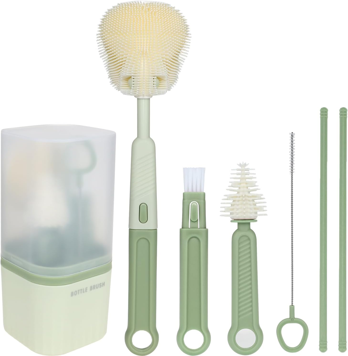 SILICONE BABY BOTTLE BRUSH SET, INCLUDES BABY BOTTLE BRUSH, NIPPLE BRUSH, STRAW BRUSH, SPOUT BRUSH, DRYING RACK AND STORAGE BOX, PORTABLE AND TRAVEL-FRIENDLY (FLAT - GREEN)