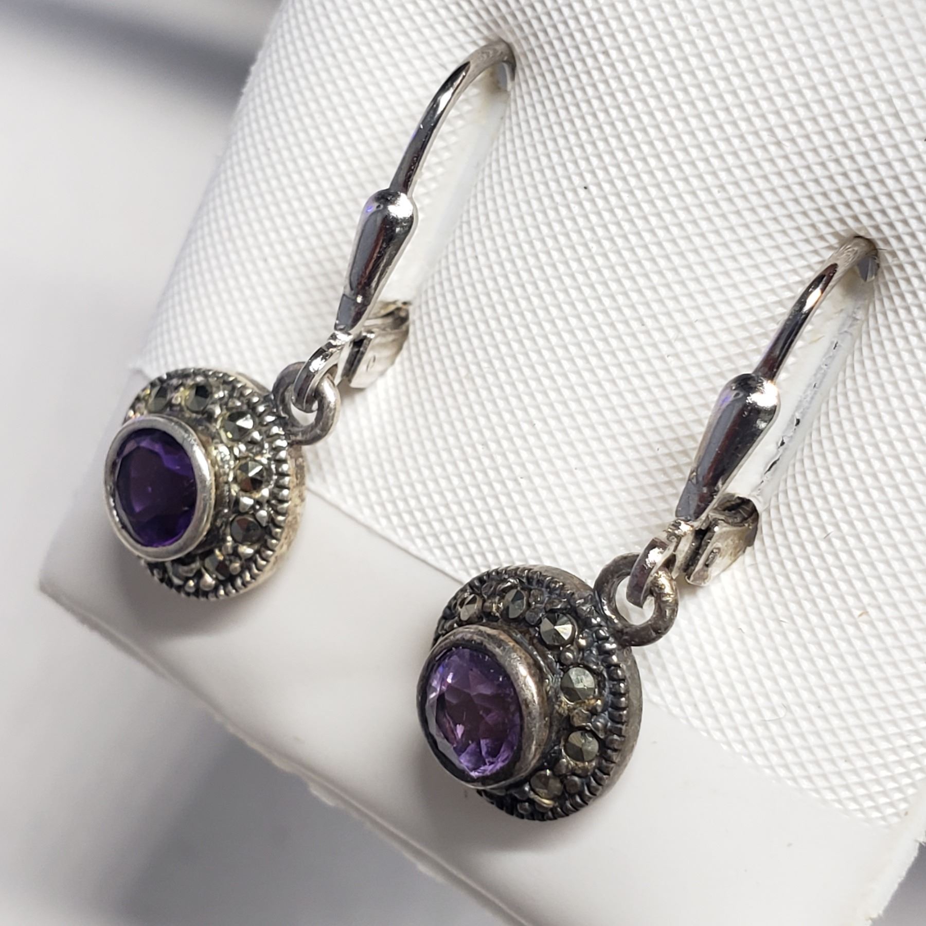 S. NO. 113 - DN49: SILVER AMETHYST MARCASITE EARRINGS.