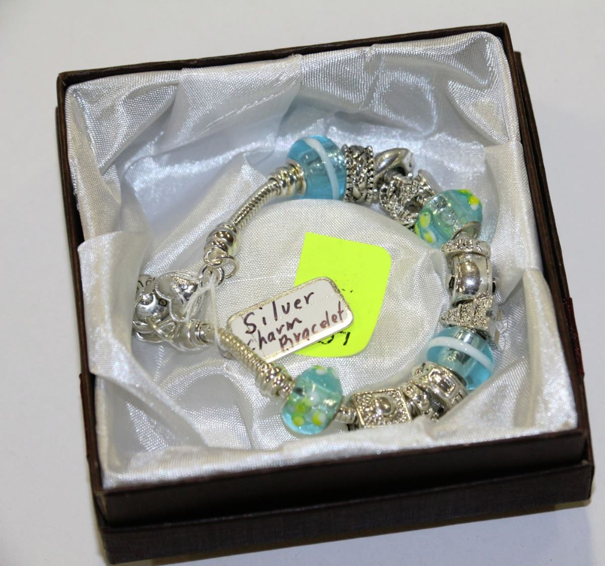 SILVER CHARM BRACELET WITH BLUE STONES AND CHARMS