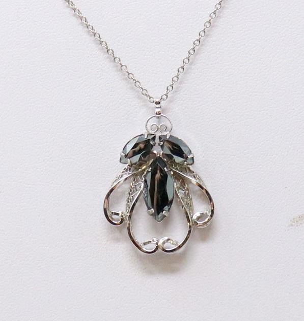 SILVER PENDANT NECKLACE WITH BLACK STONES 15"